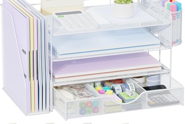 Shop Nowgianotter Desk Organizers and Accessories with File Holder, 4-Tier Desk Accessories & Workspace Organizers with Drawer and 2 Pen Holder, Paper Organiz