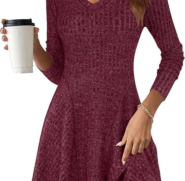 ANRABESS Women Long Sleeve Ribbed Knit Short Dresses 2025 Fall Winter V Neck Casual Swing A Line Sweater Dress