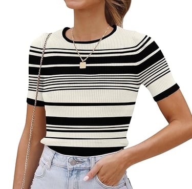 ZESICA Women's Short Sleeve Crewneck Striped T Shirt 2025 Summer Ribbed Knit Slim Fit Casual Basic Tee Tops